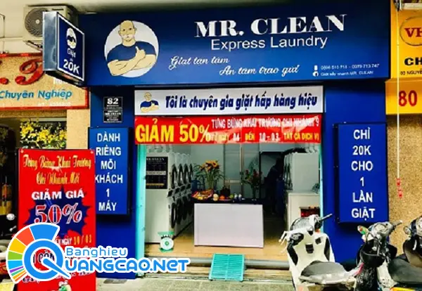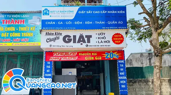 Đối với bảng hiệu giặt sấy, các thông tin hiển thị cần bao gồm tên cửa tiệm, địa chỉ, số điện thoại, slogan. Thông tin được sắp xếp khoa học, uy tín mang lại dấu hiệu ấn tượng tốt.
