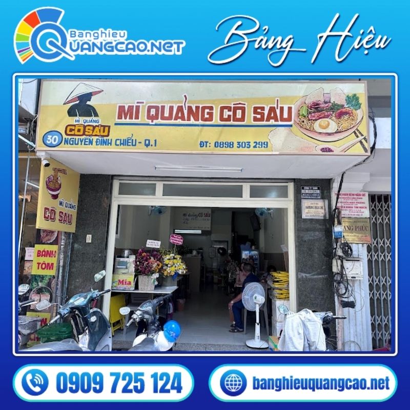 Bảng hiệu mì quảng đóng vai trò là công cụ tiếp thị trực quan tinh bén nhất giúp chủ quán thu hút thực khách và định vị chính xác hương vị đặc sản miền Trung. Người kinh doanh F&B sành sỏi luôn ghi nhớ nguyên lý “người ta ăn bằng mắt trước khi ăn bằng miệng” để đầu tư xứng đáng cho mặt tiền cửa hàng.